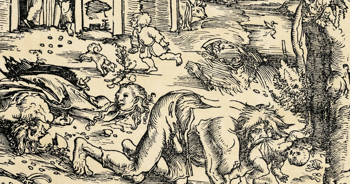 Peter Stumpp, «loup-garou de Bedburg», accusé de magie noire, cannibalisme et meurtres (1589), exécuté brutalement comme hérétique.